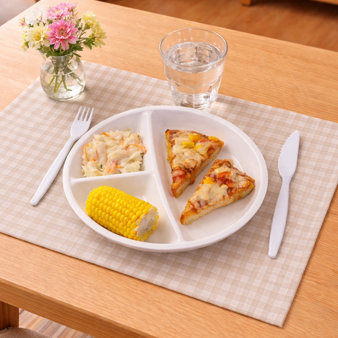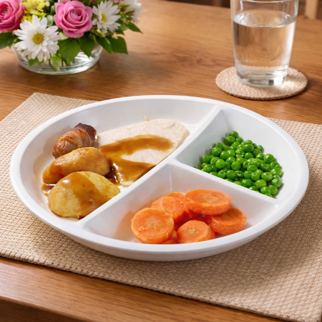 Discover our versatile White 3 Compartment Plate crafted from premium polypropylene. This plate is both sturdy and lightweight, ensuring durability with every use.